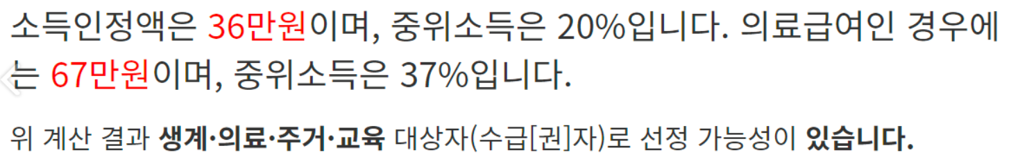 예를 들어 소득인정액이 70만원 미만이면 생계급여, 의료급여, 주거급여, 교육급여 모든 수급자 조건에 해당되지만 100만원이 나오면 주거급여와 교육급여만 조건에 해당됩니다.