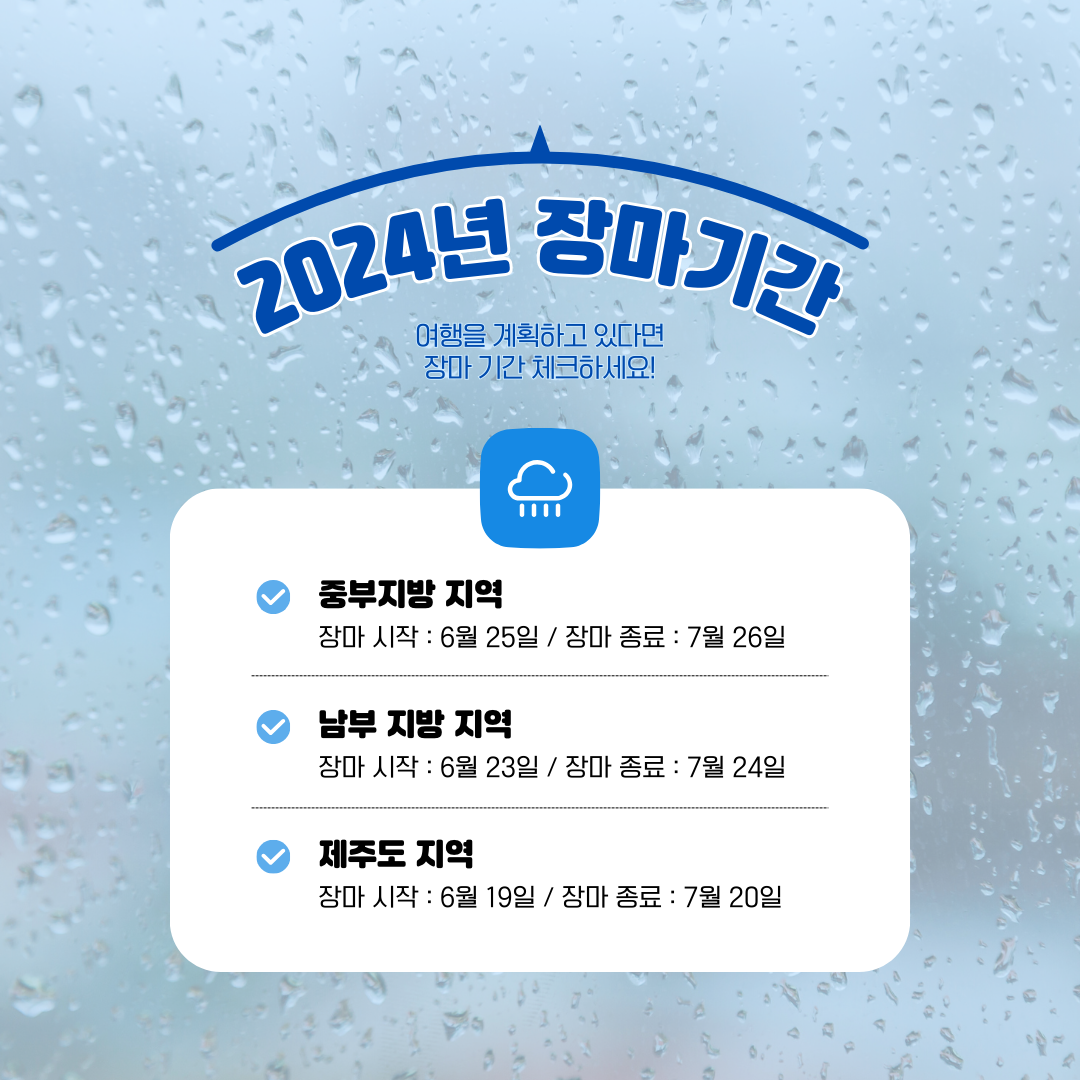 2024년 장마기간, 장마시기에 대해 알아보겠습니다. 올해는 어느 때보다 역대급 폭염과 역대급 강수량이 예상되고 있습니다. 6월 중순이 넘어가면서 비가 오기 시작한다고 하니 아래 지역별 장마시기 보시고 꼭 미리 대비하시기 바랍니다.